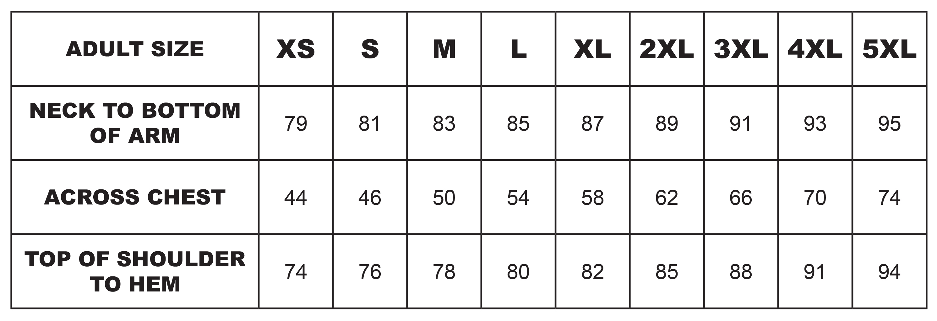 Please use the sizing guide below to order your correct size. All measurements listed are in centimeters.